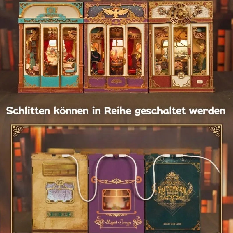 Book Nook – Magical Journey es un diorama detallado de una estantería mágica, inspirado en viajes fantásticos y artes místicas. El pequeño compartimento del tren muestra una escena vibrante con objetos flotantes, círculos mágicos luminosos y accesorios mágicos interactivos. Con su iluminación atmosférica y el efecto de profundidad espacial, transforma tu estantería en un portal a otro mundo. Ideal para fans de la fantasía, la magia y la artesanía DIY hecha con amor.