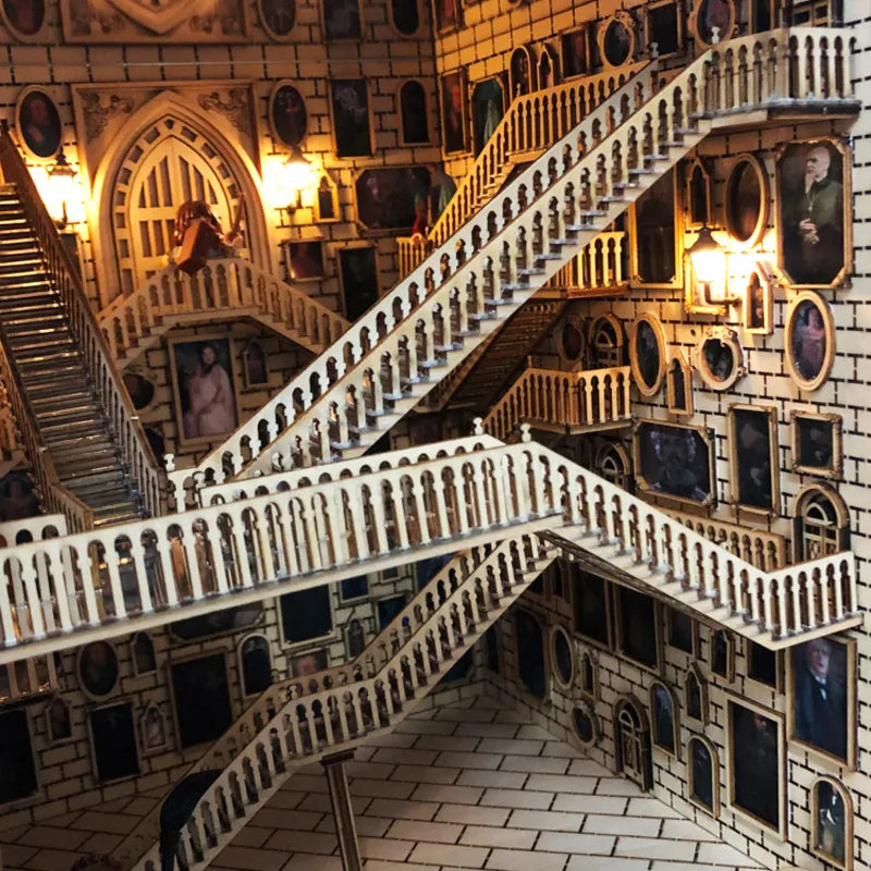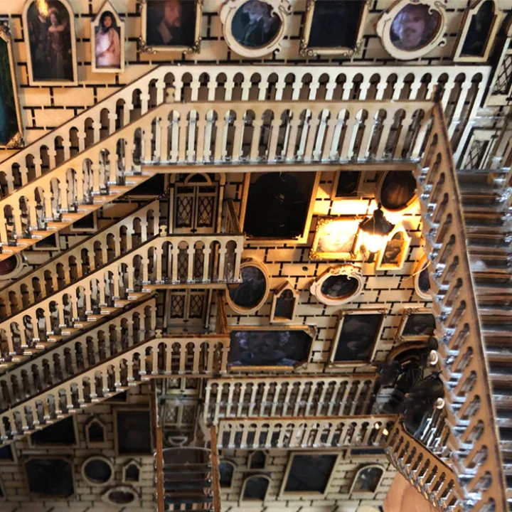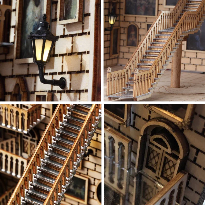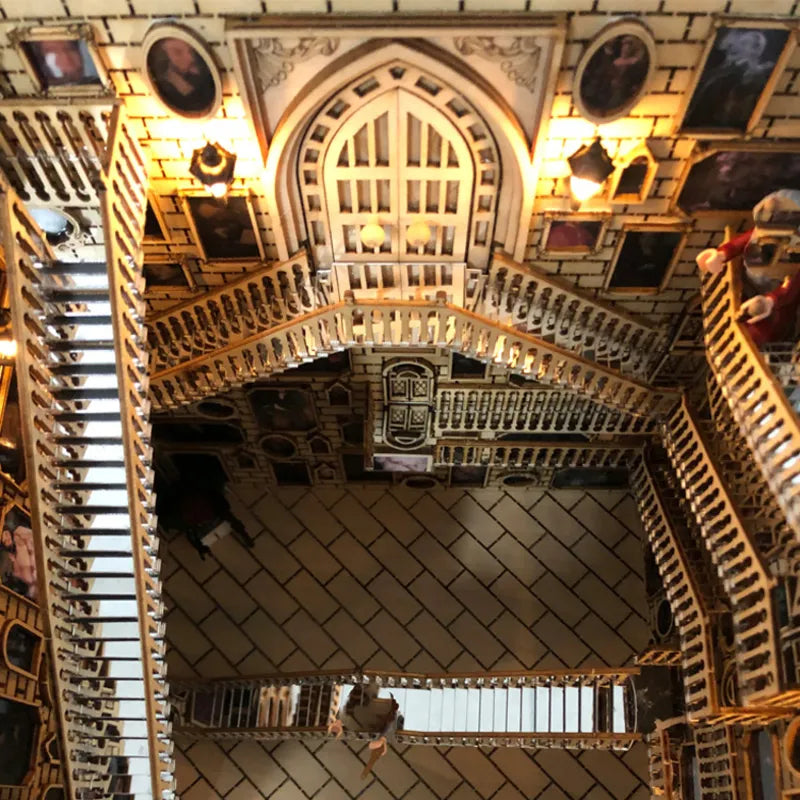 El Book Nook „Magic School“ le permite sumergirse en el encantador mundo de su mago favorito y ofrece una forma personalizable de dar vida al universo mágico de Harry Potter en su estantería. Inspirado en el encanto y la grandeza de Hogwarts, este conjunto elaborado cuenta con un elemento fascinante: un complejo sistema de escaleras con un botón de control que le permite girar las escaleras y añadir un toque de magia a su exhibición. Los marcos de fotos dinámicos dan vida a la escena, ya que las imágenes en ellos se mueven y desplazan, al igual que los retratos mágicos en los pasillos de la escuela de magia.