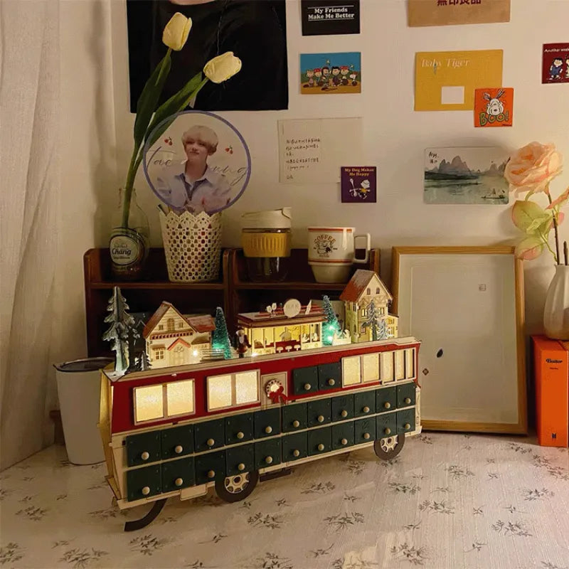 ¡Prepárese para un viaje navideño muy especial! Este calendario de adviento con escena de autobús de madera es una decoración navideña creativa que llama la atención al instante. Con su encantador diseño de autobús, el festivo "Welcome Bar" en el techo y un idílico pueblo navideño con casas y abetos cubiertos de nieve, trae momentos mágicos a su hogar.