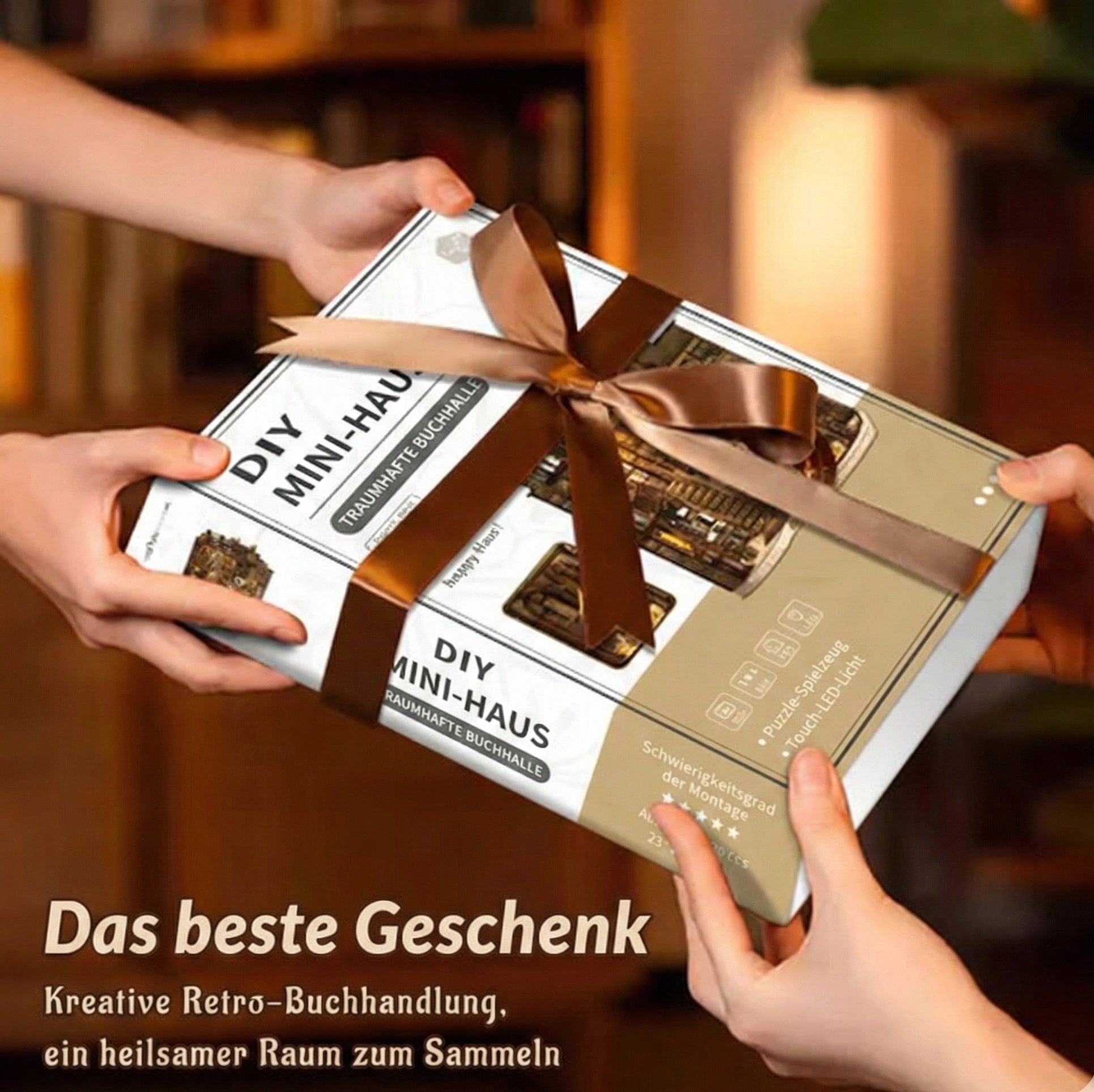Los LED incorporados bañan cada estante y cada lomo de libro con una luz cálida y difusa, no un resplandor intenso, sino el ambiente de una verdadera lámpara de lectura. Enciéndalos por la noche y su biblioteca en miniatura se convertirá en el lugar más tranquilo de la habitación. Funciona con 2 pilas AAA (no incluidas) — sin cables, sin instalación, simplemente colóquelas y disfrute.