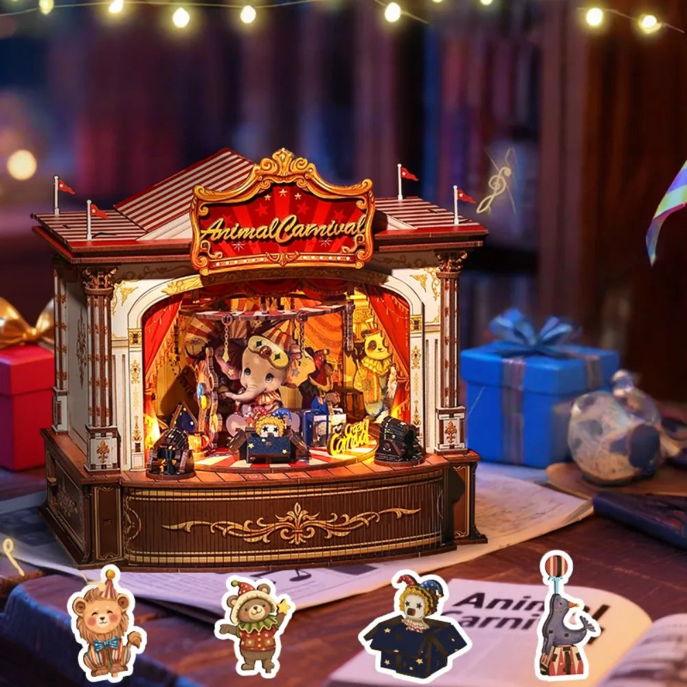 Este elaborado rompecabezas 3D de madera se convierte en una encantadora caja de música que trae la alegre atmósfera de una feria directamente a su hogar. Cree un escenario en miniatura iluminado donde adorables animales actúan al son de una hermosa melodía y despiertan recuerdos despreocupados de la infancia.